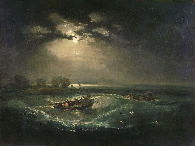下面这幅是透纳同学在21岁的时候画的油画:《海上渔夫》。这孩子当时刚刚认识到光靠水彩画是没法一鸣惊人的,于是在学了3年油画之后,于1796年搞了一张油画作品送到皇家美术学院参加年展,并一举成名。直到今天,此画里的旋涡状构图还和光影一起为人所津津乐道;大海也从此成为透纳致力于表现的一大主题。